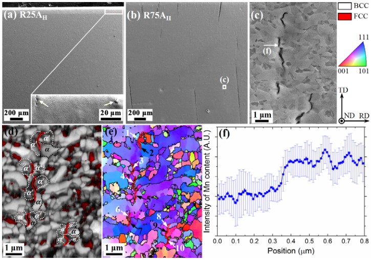 图1 (a-d)R25A和R75A的EBSD相分布图和铁素体KAM分布,(a, c)R25A;(b, d)R75A。(e)俄歇能谱定性测量Mn元素在铁素体和奥氏体中的配分情况。