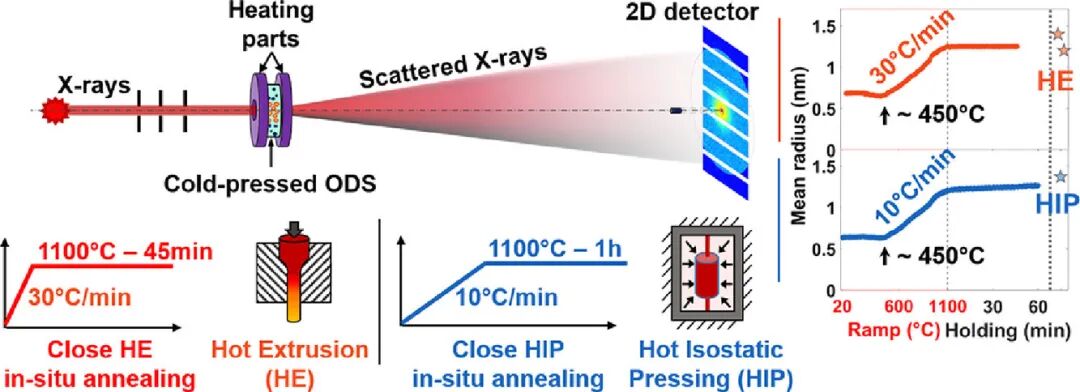 氧化物弥散强化(ODS)钢是核应用的候选材料。本研究将Fe-14Cr,Y2O3和TiH2粉末进行机械合金化后在1100℃凝固处理,得到了纳米氧化物细小弥撒分布的ODS钢。在连续加热到1100℃过程中,通过原位X射线小角散射对氧化物析出动力学进行定量分析。结果发现,研磨态存在的团簇在450-1100℃范围内发生长大,而在随后的等温退火中没有检测到粗化。原位实验得到的纳米氧化物可以代表热等静压和热挤压加工材料中的析出行为。