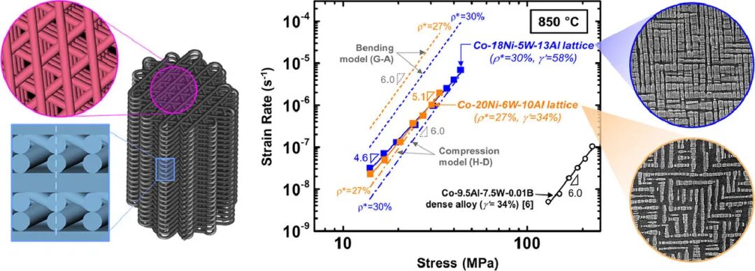 本工作通过以下途径制备了钴基高温合金微晶格:(i)含有钴、镍和钨氧化物颗粒悬浮液墨水的三维挤压打印;(ii)氧化物的氢气还原和均匀Co-Ni-W合金的烧结;(iii)用铝包覆涂层法将铝沉积到超晶格框架上,随后进行铝均匀化处理。制备的Co-(18-20)Ni-(5-6)W-(10-13)Al(原子百分比)超晶格,相对密度为27%-30%,框架直径350 μm,在750℃存在屈服强度的峰值,和γ/γ′时效组织一致。和无铝打印的Co-Ni-W晶格相比,本材料由于Al2O3表层的形成,抗氧化性能得到了大幅度提高。然而,框架内铝的消耗降低了850℃下的抗蠕变能力。即使如此,本材料的抗蠕变能力仍和相对密度35%的泡沫镍基高温合金相当。