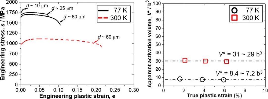 本工作研究了77K下HfNbTaTiZr体心立方高熵合金(BCCHEA)的塑性变形。拉伸应力应变曲线展示了屈服强度强烈的温度依赖性。我们用滑移线分析了77K下位错滑移的特征,确认了{112}上的主动滑移。表观激活体积(V*~7b3)表明77K下热激活弯结对(kink/kink-pair)形核。BCCHEA和纯铌在77K下的表观激活体积值几乎相同。BCCHEA的低温塑性显示了纯体心立方金属的特征,表明高熵合金的成分复杂性不会改变a/2<111>螺位错的佩尔斯势。