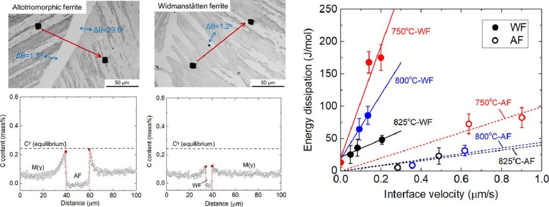 本工作提出了一种简单的方法,基于总能量耗散和界面移动速率的测量从实验上测定本征界面迁移率和外在的能量耗散。在Fe-C合金中,研究人员在非共格仿晶界铁素体(AF)和半共格魏氏铁素体(WF)中对这些参数进行了比较研究。结果表明AF中的外在能量耗散非常低而WF中为20J/mol,这和相应的相变应变有关。而且,半共格WF/奥氏体的本征迁移率远远小于非共格AF/奥氏体界面。