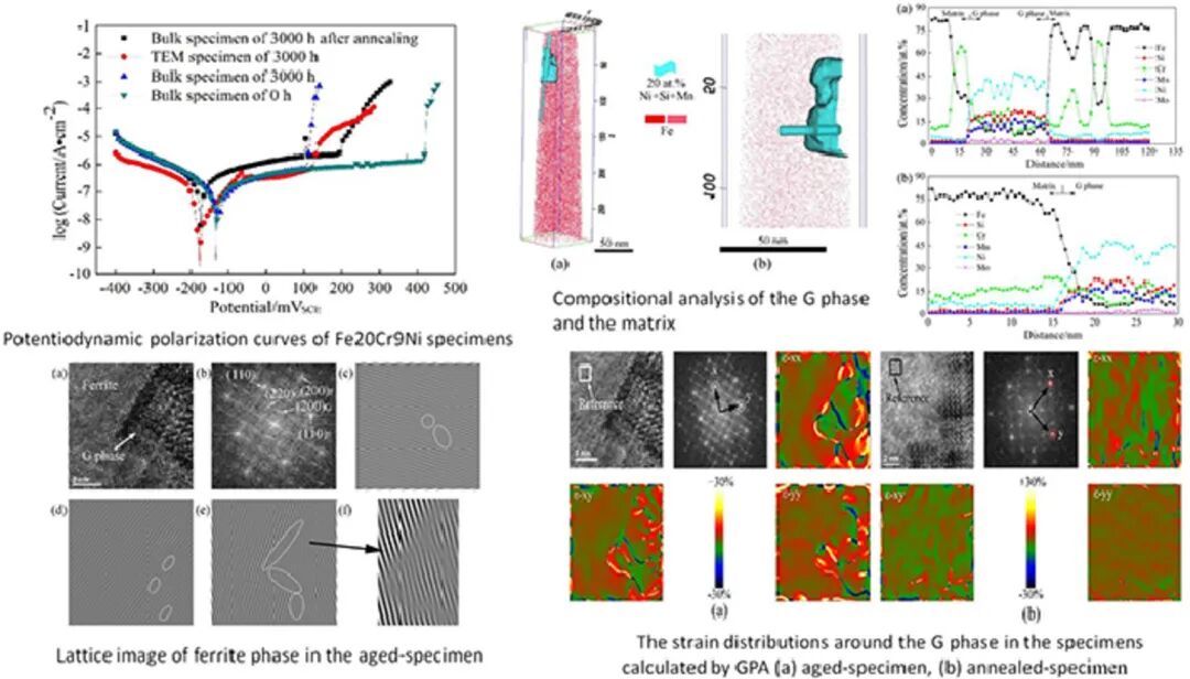 Fe20Cr9Ni铁素体-奥氏体双向不锈钢在280-320°C长时间服役时经常发生调幅分解,从而导致材料的耐蚀性能降低。通常来说,比起G相, 富Fe的α相被更多地认为是导致材料时效后耐蚀性能降低的主要原因。而我们发现,在Fe20Cr9Ni不锈钢发生调幅分解后,约76.8%的耐蚀性降低是由于G相导致的,而仅有23.2%是由于α相导致的。在本研究中,我们采用了合适的热时效处理引入了更大尺寸的G相,并研究了该相在腐蚀过程中的作用。通过将475℃ 3000h时效处理材料的TEM样品浸入NaCl溶液,我们确定了铁素体中的优先腐蚀位置。通过TEM-EDS, 3DAPT和GPA等技术,我们分析了G相附近的成分变化和应变分布。结果表明,尽管α相和α’相之间Cr的成分差异可高达60%,但腐蚀却首先在G相和铁素体基体的界面处发生,而非在富Fe的α相内发生,这表明贫Cr理论不能解释已有的实验现象。我们发现,G相和铁素体基体的界面处的应变能是最大的。在界面处的原子比在晶粒内部具有更高能量,因此更容易与溶液中的Cl−离子反应并最终形成腐蚀坑。