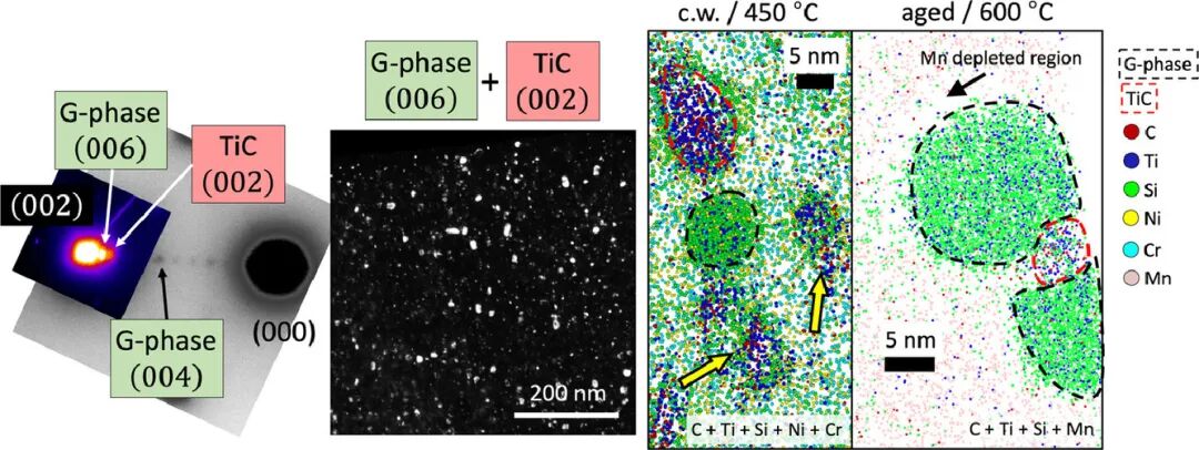 我们使用了透射电子显微镜和原子探针技术研究了钛稳定奥氏体钢在铁离子辐照下的响应。研究的重点在于辐照诱导的偏聚和析出,特别是Ti和TiC如何影响这些过程。我们使用了两种不同状态(冷加工态和时效态)的15-15Ti钢作为研究对象,在不同温度下进行辐照,辐照剂量最高达到40 dpa。我们发现,在较低的辐照温度下,冷加工和时效后的材料组织演化类似,组织中以小的Si和Ni团簇为主,即发生点缺陷处的偏聚;且时效态材料中已有的TiC析出不稳定。提高辐照温度,则将导致纳米级富铬TiC析出在富Si和富Ni的壳层周围形核。此外,组织中还形成了富Ti和富Mn的纳米级G相(M6Ni16Si7)析出,这些析出通常附着在TiC析出上。辐照后,冷加工态材料中的TiC密度大于时效态,这与其较低的G相体积分数有关。结果表明,在较高的辐照温度下,析出相与基体的界面是重要的点缺陷汇,有助于提高材料的抗辐照性能。本研究是首次对Ti稳定奥氏体钢进行类似研究,阐明了少量添加钛原子对辐照过程中组织演变的重要影响。