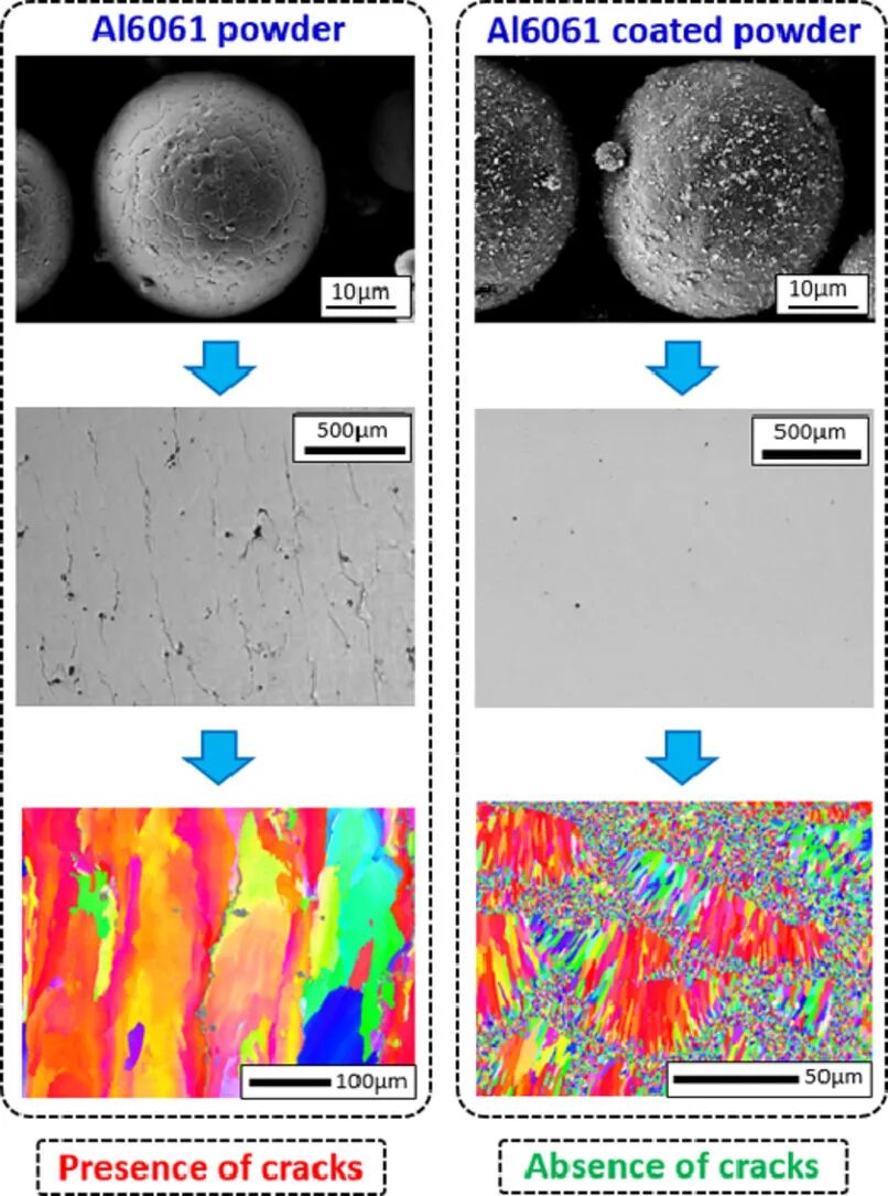 在本研究中,我们提出了一种消除激光熔化铝合金中热裂的方法,并以6061合金为例进行了验证。6061是一种沉淀强化铝合金,主要合金元素为镁和硅。这种合金因其优异的重量强度比和高导热系数而在航空和汽车工业中被广泛使用,但是却特别容易在激光熔化加工过程中发生热裂。我们提出的消除裂纹的方法是:通过引入晶粒细化阻碍柱状晶的生长。为此, 我们向Al6061金属粉末中加入了不同含量的钇稳定氧化锆(YSZ)。实验发现添加的YSZ含量对晶粒细化的效果影响很大。加入1vol %YSZ时,SEM和EBSD结果显示材料为双峰晶粒尺寸分布的等轴柱晶组织。加入2 vol% YSZ时,由于在熔池形成连续等轴带,使得热裂被完全避免。此外,TEM和DRX实验结果为3D打印过程中粒子的演化提供了新的认识。我们在已有凝固模型的基础上对实验结果进行了讨论,其中重点讨论了建立等轴凝固体系的必要条件。