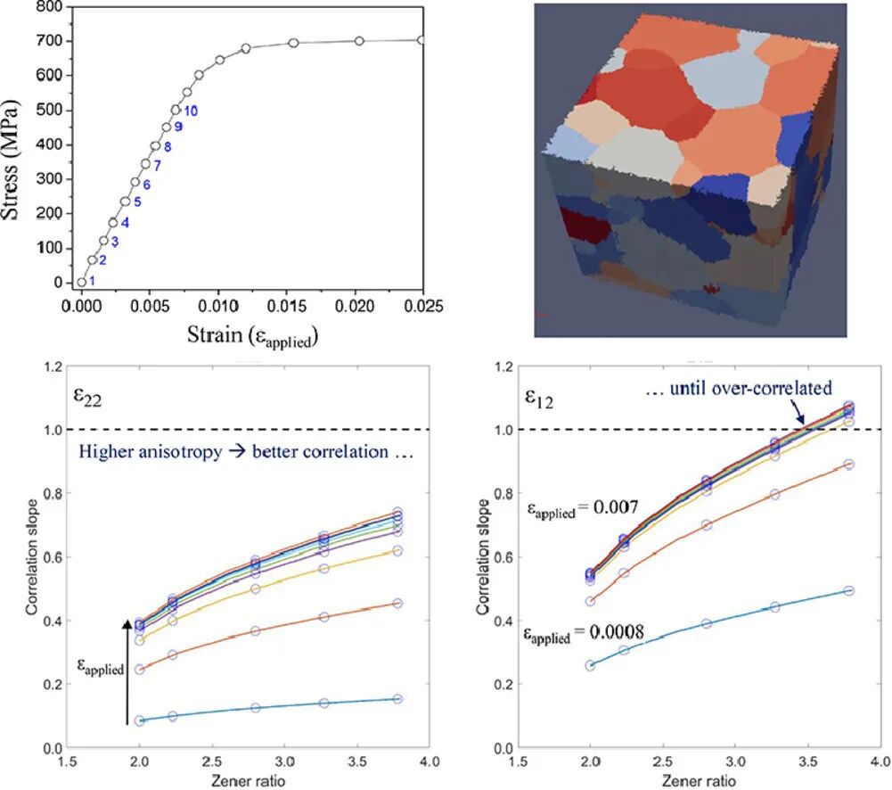 在本研究中,我们使用了原位远场和同步辐射近场X射线衍射显微(HEDM)技术,结合晶体弹性模拟,研究了一种亚稳态β-Ti合金(Timetal-18)在β淬火条件下的弹性行为。HEDM技术使我们能够对我们的多晶实验材料样品中部每一个晶粒的三维结构、弹性应变张量和晶体学取向进行全面分析。基于约100个晶粒的弹性应变和取向数据,我们给出了一种能够直接获得单晶弹性常数(SEC)的方法。由此测得的弹性模量(以GPa为单位)分别为:C11 = 118±5、C12 = 79±3、C44 = 39±4,各向异性比(A)为2.0±0.4。我们将近场HEDM测到的微观组织结构进行数字化构建后,作为快速傅里叶变换(MASSIF)应力-应变不均匀性分析的输入,模拟材料在晶粒尺度上的本构响应。模拟预测的弹性应变张量演化与实验结果吻合良好。需要注意的是,单个晶粒之间的相互比较突出了弹性各向异性的影响,因此弹性各向异性参数A可能大于2。此外,我们也对该模拟方法的准确性和塑性区的晶粒本构相应进行了讨论。