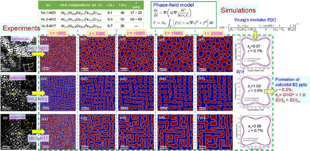 在本工作中,我们使用了相场模型模拟了BCC基体的Al-Ni-Co-Fe-Cr 高熵合金中的共格BCC/B2组织。在实验中,这些共格的BCC/B2组织中含有球形或立方的纳米沉析出,并且有时会发生调幅分解。我们基于Chan-Hilliard方程,利用COMSOL软件建立了二维相场模型,揭示了高熵合金中这种组织的演化过程。模拟的析出与调幅分解与实验结果吻合较好。析出相与基体之间的晶格错配和杨氏模量各向之间的差异都会影响析出相的形貌,其中立方纳米析出对模量各向异性尤其敏感。基于模拟结果,我们进一步讨论了析出物的粗化行为。我们的研究表明,相场模型可以很好地预测高熵合金的组织演变并辅助新型高熵合金的设计。