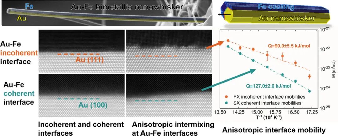 异相界面上的纳米尺度扩散是控制多层材料固态相变和混合的基本过程。在本研究中,我们使用实验直接地证明了,纳米尺度的多相相互扩散过程是由界面迁移率控制的。我们在Fe-Au纳米晶须中观察到了各向异性扩散混合,其中Fe穿过非共格Fe-Au界面进入Au的扩散深度比共格对比组要大得多。利用一个简单的动力学模型分析测得的结果后,我们得到了共格和非共格Fe-Au界面迁移率的绝对值,以及描述其与温度之间的关系的Arrhenius参数。分辨率达到原子尺度的扫描透射电镜实验证实了共格界面的低迁移率是由于界面分离形核困难导致的。我们认为这是决定了混合速度的动力学瓶颈。我们的研究结果表明,界面迁移率的各向异性是导致许多非均相固态相变中析出相形貌各向异性的主要因素。