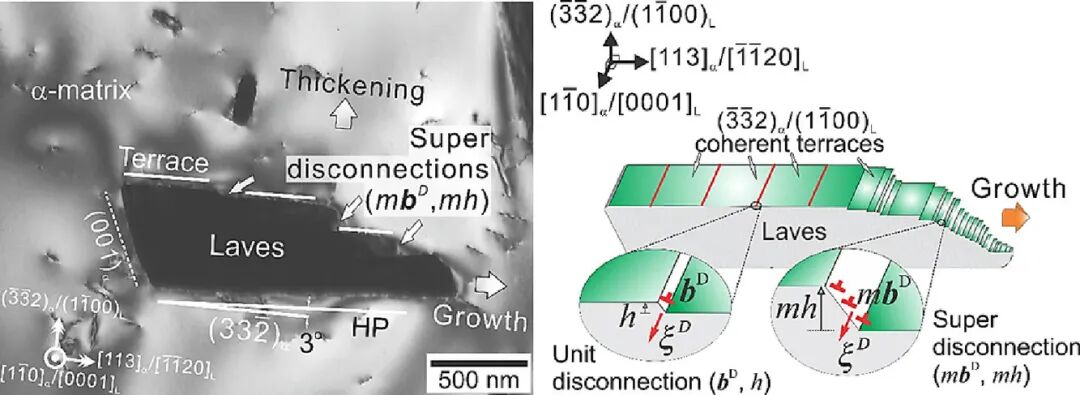 尽管目前学界广泛认为Laves相可以对含Cr不锈钢起到强化作用,但我们对于Laves相的组织演化却知之甚少。在此,我们研究了高Cr铁素体不锈钢Fe-20Cr-2Mo-0.5Nb (at%)在1073K退火不同时间Laves (C14)相的演化。退火过程中,α相中形成了大量(Fe,Cr)2(Mo,Nb)析出。Laves相的形貌演化遵循以下顺序:球形→椭球形→针形→盘形。Laves相和基体有两套位向关系,OR1: [-1-12] α/[1-210]L、[111]α/[0-110]L、[1-10]α/[000-1]L,OR-2: [1-10]α/[0001]L、[113]α/[-1-120]L、[-3-32]α/[1-100]L。Laves相的惯析面略微偏离。实验观测到界面缺陷,即所谓的分离带(bD, h)和超分离带(mbD, mh)沿惯析面分布,这与OR2参考坐标系下的理论预测相一致。bD伯氏矢量的边缘分量byD (0.1539 nm)平行于Y/[113]α/[-1-120]L,并有一垂直于台阶的bzD分量(0.0747 nm)。同时,重叠步长高度h =d[1-100]L。我们通过分离带和超分离带在{-3-32}α/{1-100}L台阶上沿<113>α/<-1-120>L方向的横向运动对Laves析出相的演化进行了描述,并发现分离带阵列能够适应{-3-32}α/{1-100}L台阶引起的错配应变。