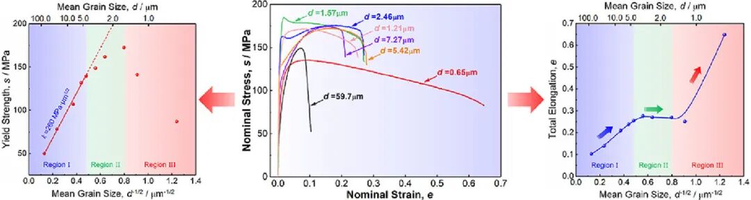 由于镁合金的各向异性密排六方(HCP)结构限制了独立滑移体系的数量,因此镁合金在室温下的强度和延展性往往较差。本研究中,我们发现通过调整主要变形模式,可以在块体多晶纯镁中实现优异的强度和延展性耦合。我们成功制备了一系列具有不同平均晶粒尺寸的纯镁完全再结晶试样(其中最小的平均晶粒尺寸为650 nm),并系统地阐明了室温力学性能、变形机理与晶粒尺寸之间的关系。在常规粗晶区,塑性变形受形变孪晶和滑移控制;当晶粒细化到几微米时,孪晶被抑制;而在平均晶粒尺寸小于1μm的超细晶(UFG)试样中,晶界滑移占主导地位。形变模式的转换使得拉伸延伸率显著提高,且不再遵循Hall-Petch公式。通过详细的微观组织观察和理论计算,我们定量地证实了:强度和延展性的变化是由于不同尺寸的晶粒激活不同形变模式的临界剪切应力不同而导致的。