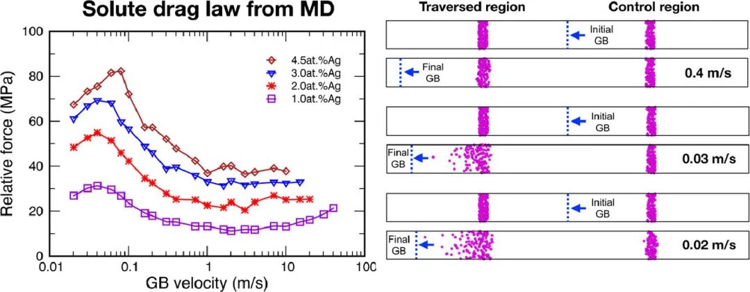 我们研究发现,分子动力学模拟能够很好地展现移动晶界处的溶质拖曳。尽管晶格扩散在分子动力学的时间尺度上处于近似停止状态,但晶界处的快速扩散使得偏聚溶质原子的运动能够跟得上晶界的迁移。这一研究结果为我们提供了基于分子动力学方法,在原子尺度上精确研究溶质拖曳效应的可能性。我们发现,晶界在迁移过程中激活了其扫过位置处的晶界扩散,改变了晶格的短程有序态。同时,我们还发现,移动的晶界同时还在拖拽非平衡空位,使得附近晶格区域的扩散大大加快。