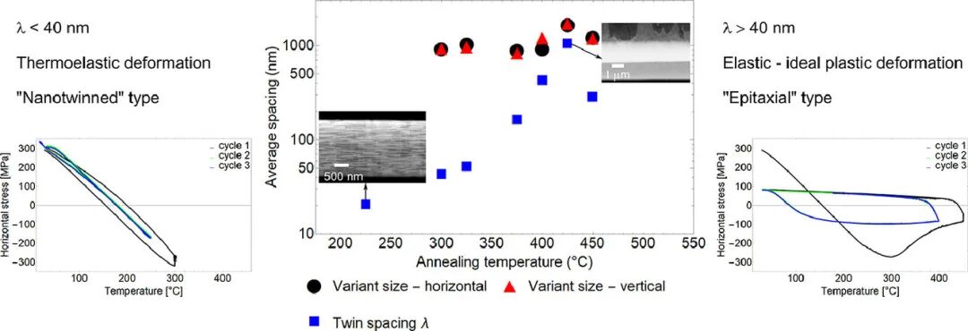 文献中对于硬基板上多晶硅(通常有织构)和外延FCC金属薄膜的曲率测量表明这两类薄膜都具有独特的应力-温度演化特征。外延薄膜具有独特的弹性特点——无存储位错且在循环应变过程中具有高可重复性的理想塑性;而多晶薄膜除了会在高温下通过扩散蠕变产生松弛外,还会在冷却过程中发生显著硬化。在本研究中,我们研究了一种利用电子束沉积方法在(111)Si基板上沉积的外延纳米孪晶Ag的形变特点。我们通过热处理对孪晶Ag的孪晶间距λ进行调控,并且通过测量晶片曲率记录了热变形特征随孪晶间距的变化曲线,其中孪晶间距从20nm变化到1μm。此外,我们还将其与外延双晶薄膜、含共格孪晶界的双晶微柱和纳米孪晶微柱等其他FCC金属在微米或亚微米尺度的变形进行了比较。