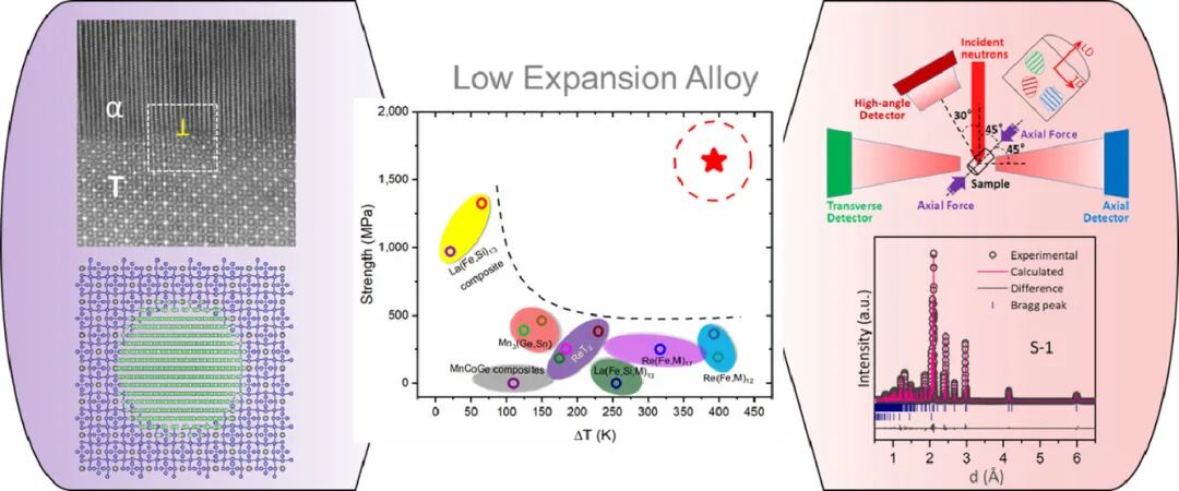 低热膨胀合金由于其在热冲击下的尺寸稳定性,而在高精度仪器设备中具有重要作用。然而,低热膨胀率合金往往机械性能差,韧性差,抗断裂能力低,这大大限制了其作为功能材料的应用。在本研究中,我们通过在具有显著磁体积效应的硬质金属间化合物基体中析出一种韧性相,制备出了一种同时具有优异机械性能和功能特性的新型的Er-Fe-V-Mo金属间化合物双相合金。研究发现,当含有12.8±0.1vol% 沉淀相时,合金的强度和韧性提高了一个数量级,同时在较宽的温度范围内(100 ~ 493 K)保持了较低的体热膨胀系数(1.87±0.02×10−6 K−1)。实时原位中子衍射、同步辐射X射线衍射和显微分析实验表明,析出相的热膨胀和力学性能均与基体通过半共格界面相互耦合; 更重要的是,析出相通过位错滑移产生了显著的应变硬化,减轻了局部应力,从而阻碍了微裂纹在金属间化合物基体中的扩展。该合金制备工艺简单,热循环稳定性好,具有很大的应用潜力。这项研究对于低热膨胀合金以及其他高性能金属间化合物材料的设计具有重要的启发意义。