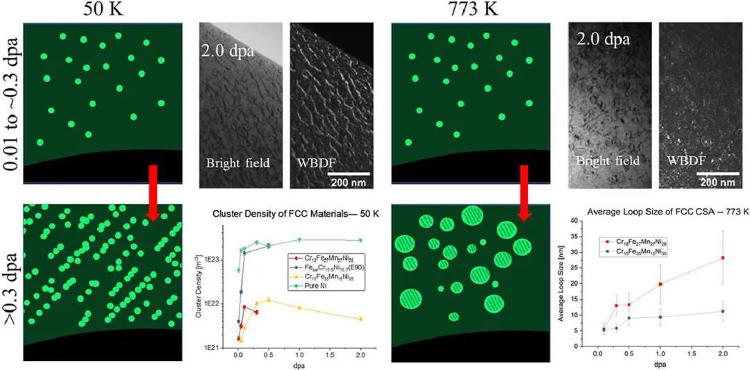 本研究对单相复杂组分固溶体合金(CSA)在重离子辐照条件下的组织演变进行了表征,以分析其在先进裂变系统中的抗辐照机制。我们结合了原位透射电子显微镜技术对3种CSA合金和3种对照组材料在50 K和773 K下进行了不同程度辐照剂量的1 MeV Kr++离子辐照实验。其中三种CSA合金分别为:Cr18Fe27Mn27Ni28、 Cr15Fe35Mn15Ni35和等原子比的NbTaTiV合金;3种对照组材料分别为纯Ni、E90合金(作为CrFeMnNi合金对照组),以及纯V(作为NbTaTiV合金对照组)。低温辐照条件下,面心立方CSAs中产生了小型缺陷团簇和12nm左右的位错环。低温下热扩散被抑制,所有CSAs的缺陷密度都低于其对照组材料,这表明在位移级联阶段产生的点缺陷减少了。高温辐照条件下,在Cr18Fe27Mn27Ni28和Cr15Fe35Mn15Ni35两种FCC结构CSA中观测到了间隙位错环的形成,在2dpa的辐照剂量下,其间隙位错环的平均尺寸分别为27 nm和10 nm。这种位错环的形成长大动力学差异是由于锰含量不同所导致,锰元素通过增加空位迁移率或降低层错能影响位错环的形核率。