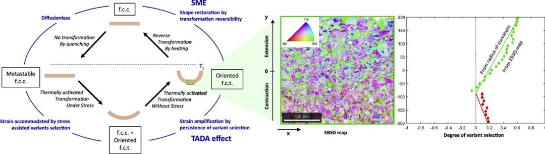 在之前发表的工作中,我们利用电子背散射衍射(EBSD)技术,对接近等原子比的金红石结构多晶Au-Cu合金在A1→L10相变过程中的变体选择进行了研究。通过对晶格畸变进行数学描述,并结合最大功准则,我们成功地对变体选择的程度进行了量化。基于同样的方法,我们研究了一种20年前在等原子比AuCu-Ga合金中发现的有趣的形状畸变效应。具体来说,我们详细研究了弯曲后再热处理这整个过程中,薄片试样的形状畸变。通过对相变过程和样本曲率的观察测量,我们探究了合金奇特的形状记忆和畸变放大效应,我们把这称之为TADA效应。样本的EBSD分析结果揭示了样品变体选择的潜在机制。我们将实验测得的变选择分布与欧拉-伯努利光束理论的预测结果进行了比较。两者具有较好的一致性,这表明变体选择是导致金红石结构合金发生宏观变形的原因。当外部应力被释放时,TADA效应就会发生,并且TADA效应强烈地依赖于相变初始阶段的应力。这种不寻常的现象被认为是由于在整个相变过程中持续发生变体选择而导致的。