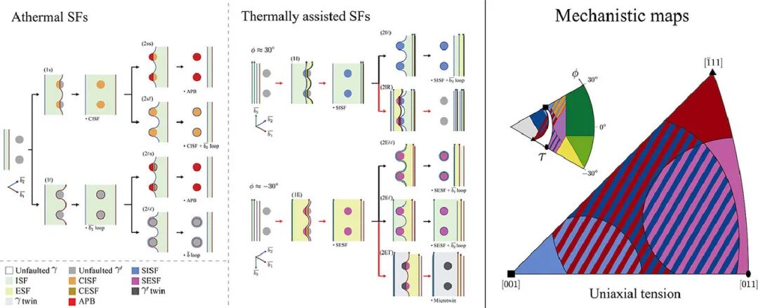 超晶格层错的扩展是在影响镍基高温合金中温蠕变性能的主要因素。根据位错的分布以及位错与析出的相互作用,这些平面缺陷可能在各种位置出现。尽管文献中已经对这些层错进行了大量表征,但是尚未有系统理论用于解释这些层错的配置情况。我们通过拉伸蠕变实验结合TEM、SEM和EBSD对多晶中的层错类型进行了定量研究。我们观测到了一种由析出层错和基体层错共同组成的新型缺陷结构,并提出了其形成机制。结合文献中的一些单晶数据,我们把实验结果纳入了已有的稳定预测框架中,以衡量取向对这些层错的影响。我们首先建立了一系列不同位错构型在立方和球形析出条件下发生层错扩展的一维力学平衡分析模型,随后将该模型应用到了6种超晶格和孪晶结构。模型提供了用于解释了应力、取向和微观结构的全新物理图像,这些预测结果与实验能够很好地定性吻合。