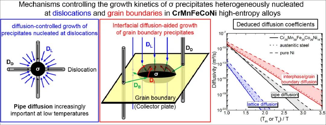 Key mechanisms and elementary diffusion processes that control the growth kinetics of σ precipitates in high-entropy alloys were investigated in the present study. For this purpose, an off-equiatomic Cr26Mn20Fe20Co20Ni14 alloy with an initially single-phase FCC structure was subjected to isothermal heat treatments, which are known to promote the formation of σ phase, i.e., aging between 600 °C and 1000 °C for times ranging from 0.1 h to 1000 h. The growth kinetics of σ precipitates at grain boundaries of the FCC matrix and those located within the interior of the grains were analyzed separately. The latter precipitates are found to grow through direct substitutional diffusion of Cr-solutes towards and Mn, Fe, Co, and Ni away from them and the growth rate of the allotriomorphs can be rationalized by the collector plate mechanism of interfacial diffusion-aided growth. From the growth-kinetics data obtained in the present study, lattice interdiffusion coefficients as well as diffusivities along crystalline defects were obtained. Above 800 °C, the growth kinetics are dominated by lattice interdiffusion of Cr in the FCC matrix described by DL = 9.8×10-4exp[(-300 kJ/mol)/(RT)] m2/s. At lower temperatures, the growth kinetics are enhanced by fast interdiffusion along dislocation pipes, which temperature dependence is given by DD = 5.0×10-3exp[(-205 kJ/mol)/(RT)] m2/s. The Cr-diffusivity along σ/FCC interphase boundaries deduced from the thickening kinetics of grain boundary precipitates can be represented by the Arrhenius relationship DI = 0.5×10-4exp[(-145 kJ/mol)/(RT)] m2/s, which is similar to that found for grain boundary interdiffusion in metals and alloys.