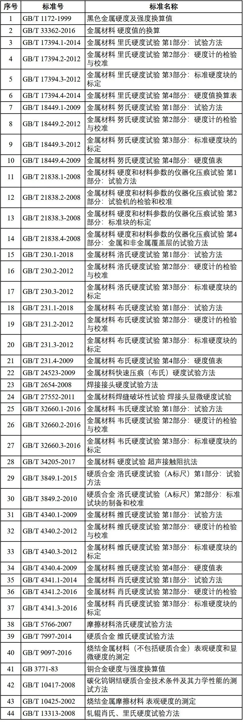 我国对金属材料不同硬度的试验方法和硬度值换算都制定了相关标准,常用硬度国标主要包括: