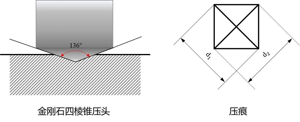 将顶部两相对面有规定角度(136°)的的正四棱锥体金刚石压头用一定的试验力压入试样表面,保持规定时间后,卸除试验力,测量试样表面压痕对角线长度。