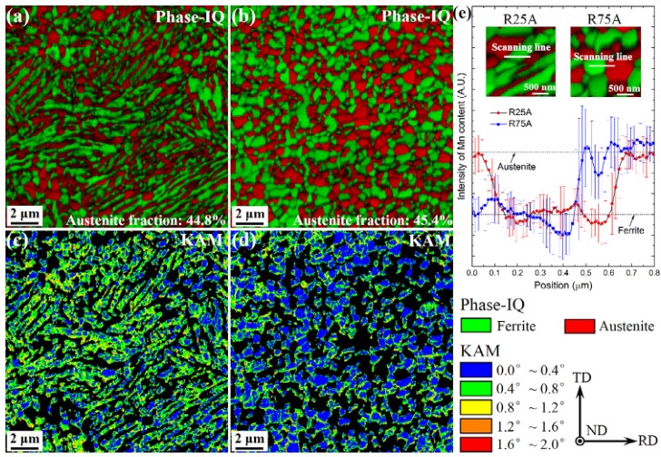 图1 (a-d)R25A和R75A的EBSD相分布图和铁素体KAM分布,(a, c)R25A;(b, d)R75A。(e)俄歇能谱定性测量Mn元素在铁素体和奥氏体中的配分情况。