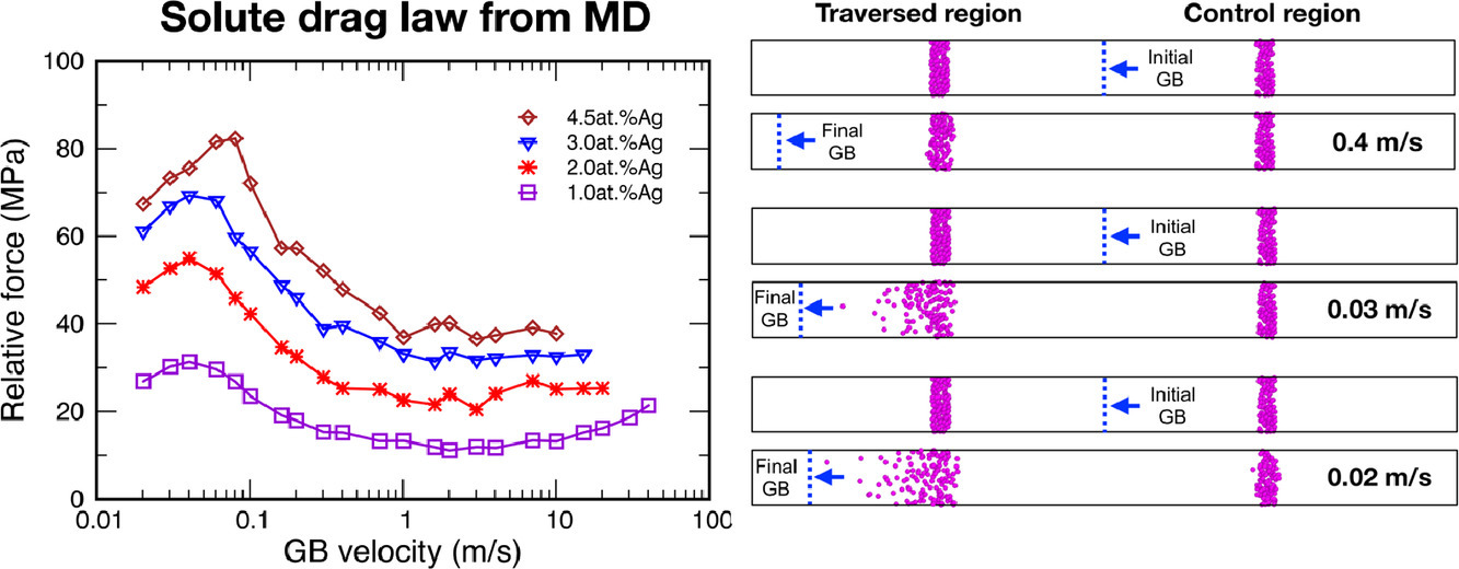我们研究发现,分子动力学模拟能够很好地展现移动晶界处的溶质拖曳。尽管晶格扩散在分子动力学的时间尺度上处于近似停止状态,但晶界处的快速扩散使得偏聚溶质原子的运动能够跟得上晶界的迁移。这一研究结果为我们提供了基于分子动力学方法,在原子尺度上精确研究溶质拖曳效应的可能性。我们发现,晶界在迁移过程中激活了其扫过位置处的晶界扩散,改变了晶格的短程有序态。同时,我们还发现,移动的晶界同时还在拖拽非平衡空位,使得附近晶格区域的扩散大大加快。
