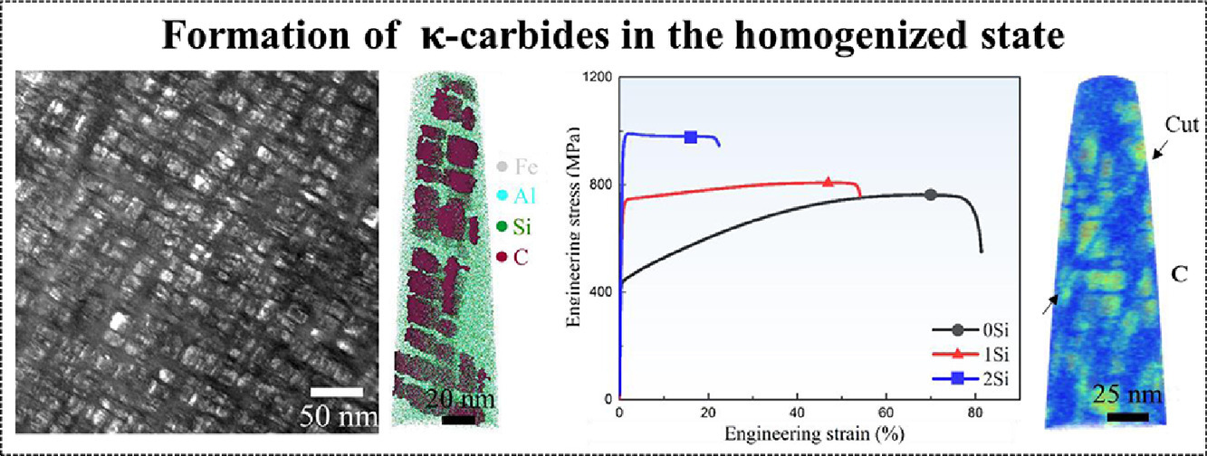 The formation of κ-carbides in austenite Fe-30Mn-9Al-1.2C (wt. %) lightweight steels is tuned via alloying of Si (0, 1, 2 wt. %), an element that can remarkably raise the activities of Al and C based on thermodynamic calculations. Ordered L12 nano-domains (with a size <1 nm), lacking elemental partition, were observed in the solution-treated steel without Si alloying, while with the increase of Si to 2 wt. %, cuboidal L′12 intragranular κ-carbides were well developed with an average size of 11.5 nm and a volume fraction of 25.9 %. These κ-carbides found in the solution-treated steel with 2 wt. % Si follow a different precipitation route from previous pathways that require aging. Also, particle-shaped L′12 intergranular κ0-carbides and DO3 phase were formed at austenite grain boundaries in the steel with 2 wt. % Si. The precipitation of κ-carbides in grain interiors leads to an improvement of the yield strength from ~450 MPa to ~950 MPa as the Si content increases from 0 to 2 wt. %. The primary deformation mechanism is the formation of slip bands in all three steels, which involves the shear of ordered nano-domains or κ-carbides. The uniform distribution of the slip bands is essential for the high strain hardening, provided by the dynamic slip band refinement in the steel without Si. Lower strain hardening is seen in the steel with 2 wt. % Si due to the formation of localized coarse slip bands. These findings offer valuable insights into the design of high-performance lightweight steels.